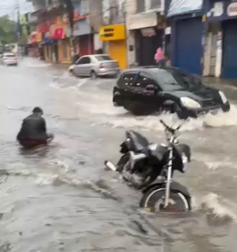 Durante o dia, uma loja da região foi invadida pela água após a rua ficar completamente alagada. Segundo o lojista, o problema não é novo e se repete sempre que a chuva é mais forte. Além do susto, ficam os prejuízos e a insegurança de quem depende do comércio local para trabalhar.